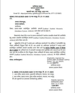 छत्तीसगढ़ के सभी सरकारी दफ्तरों में AEBAS अनिवार्य, GAD ने जारी किया आदेश
