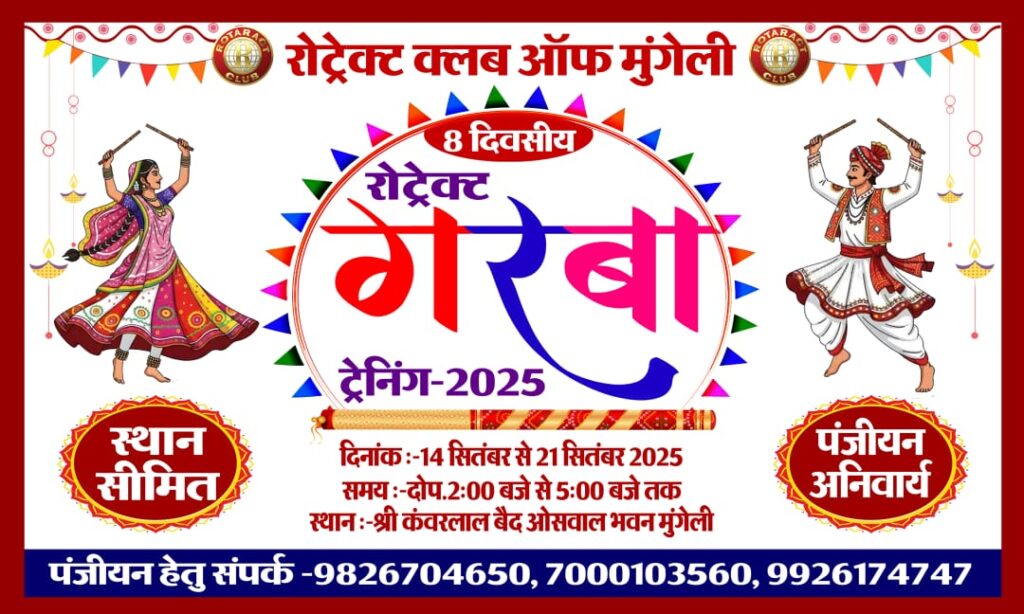 रोट्रैक्ट गरबा महोत्सव के प्रभारी रविंद्रर छाबड़ा ने बताया कि 13 साल से ऊपर की बालिका एवं महिलाओं को गरबा ट्रेनिंग कैंप में गरबा के नए-नए स्टेप्स सिखाए जाएंगे एवं मुंगेली क्षेत्र की बालिका /महिलाओं से अपील की इस कैंप में अधिक से अधिक संख्या में शामिल होकर गरबा के नए स्टेप सीखे। स्थान सीमित तथा भीड़ से बचने के लिए पूर्व में अपना पंजीयन अवश्य कर ले।