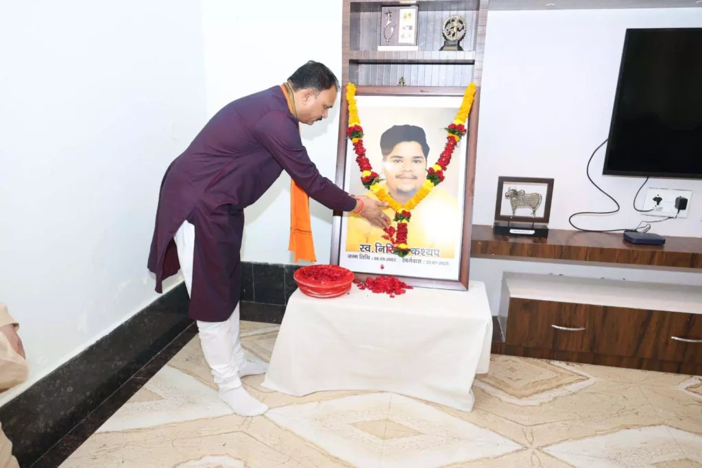 रायपुर। छत्तीसगढ़ के स्वास्थ्य मंत्री श्याम बिहारी जायसवाल आज फ़रसगांव पहुंचे, जहां उन्होंने पूर्व सांसद श्री दिनेश कश्यप के पुत्र एवं वर्तमान कैबिनेट मंत्री श्री केदार कश्यप के भतीजे स्वर्गीय निखिल कश्यप के तैलचित्र पर पुष्प अर्पित कर उन्हें भावपूर्ण श्रद्धांजलि अर्पित की। स्वास्थ्य मंत्री ने दिवंगत आत्मा की शांति के लिए प्रार्थना करते हुए कहा कि यह दुखद घटना समूचे क्षेत्र के लिए गहरी क्षति है। उन्होंने शोक संतप्त परिजनों के प्रति संवेदना प्रकट करते हुए कहा कि ईश्वर इस कठिन समय में परिवार को संबल एवं धैर्य प्रदान करे। निखिल कश्यप एक प्रतिभाशाली, मिलनसार और सामाजिक मूल्यों से परिपूर्ण युवा थे।