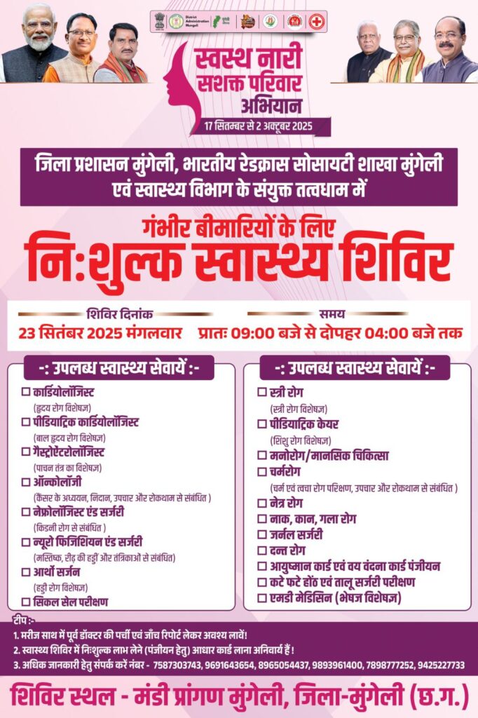 मुंगेली, 22 सितम्बर 2025// भारत सरकार के स्वास्थ्य मंत्रालय द्वारा 17 सितम्बर से 02 अक्टूबर तक संचालित ‘स्वस्थ नारी, सशक्त परिवार अभियान’ चलाया जा रहा है। इसी कड़ी में जिला मुंगेली में भी स्वास्थ्य विभाग द्वारा जनहित में विविध कार्यक्रम आयोजित किए जा रहे हैं। कलेक्टर कुन्दन कुमार के मार्गदर्शन में जिला प्रशासन, स्वास्थ्य विभाग एवं रेडक्रॉस सोसायटी के संयुक्त तत्वाधान में 23 सितम्बर को आदर्श उपज कृषि मंडी परिसर में ‘निःशुल्क मेगा स्वास्थ्य शिविर’ का आयोजन किया जाएगा।