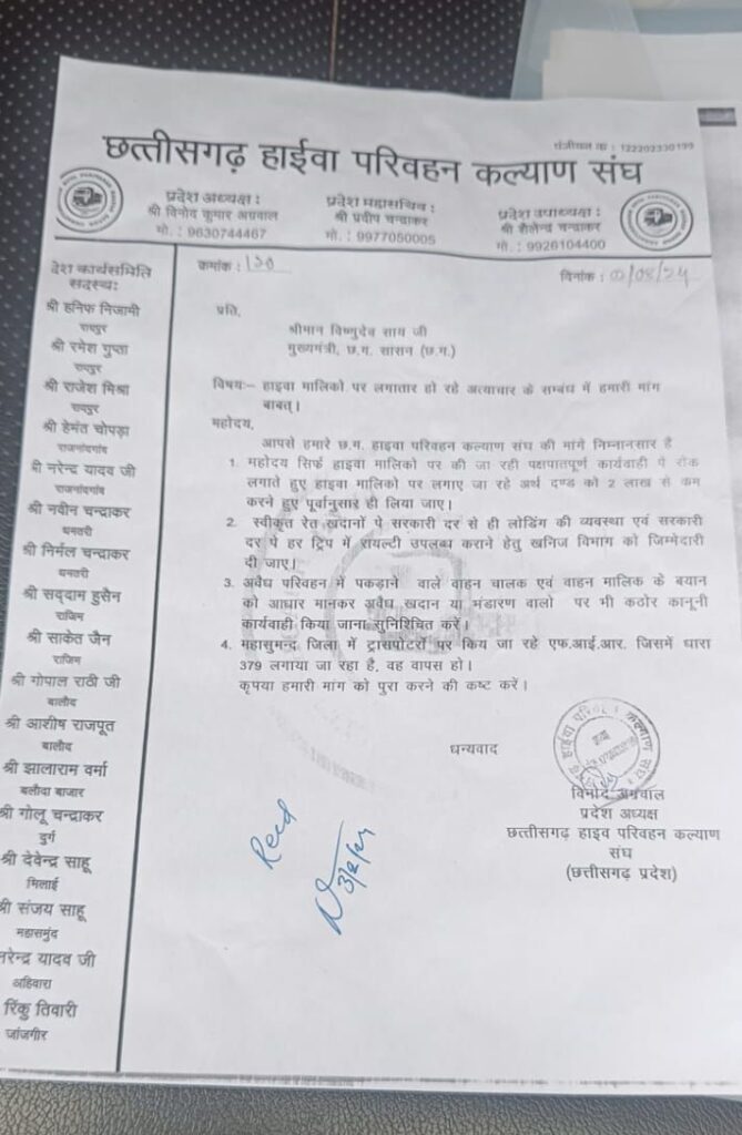 प्रदेश अध्यक्ष विनोद कुमार अग्रवाल ने उक्त जानकारी देते हुए आगे बताया कि धमतरी में हमारे द्वारा अपनी मांगों को लेकर कलेक्टर कार्यालय के समक्ष मौन प्रदर्शन के साथ गुहार लगायी जा चुकी है।अधिकारी केवल ट्रक ड्राइवर और उसके मालिकों पर ही कार्रवाई कर रहे हैं ।