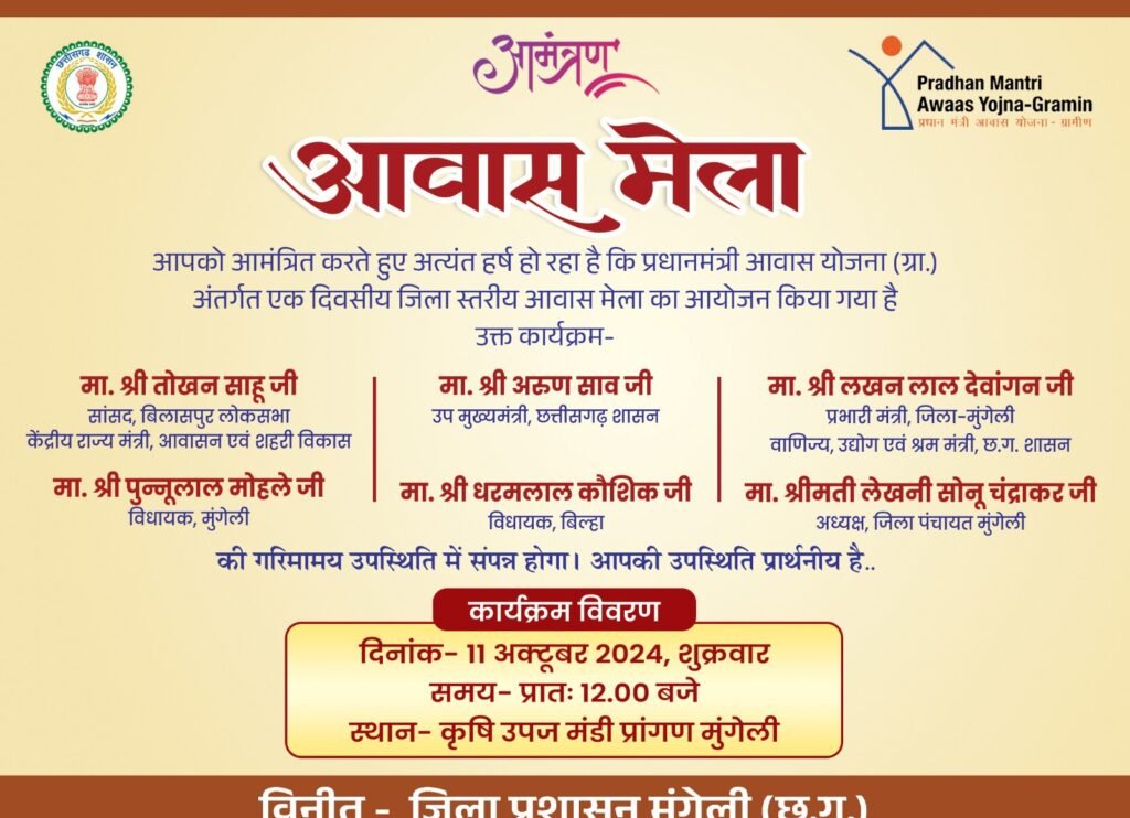 प्रधानमंत्री आवास योजना (ग्रामीण) अंतर्गत एक दिवसीय इस आवास मेला में मुख्य रूप से केंद्रीय राज्यमंत्री आवासन एवं शहरी विकास तोखन साहू, उपमुख्यमंत्री छत्तीसगढ़ शासन अरुण साव, वाणिज्य उद्योग व श्रम मंत्री ,प्रभारी मंत्री जिला मुंगेली लखनलाल देवांगन, विधायक मुंगेली पुन्नुलाल मोहले, विधायक बिल्हा धरमलाल कौशिक, अध्यक्ष जिला पंचायत मुंगेली लेखनी सोनू चंद्राकर की गरिमामय उपस्थिति में सम्पन्न होगा।