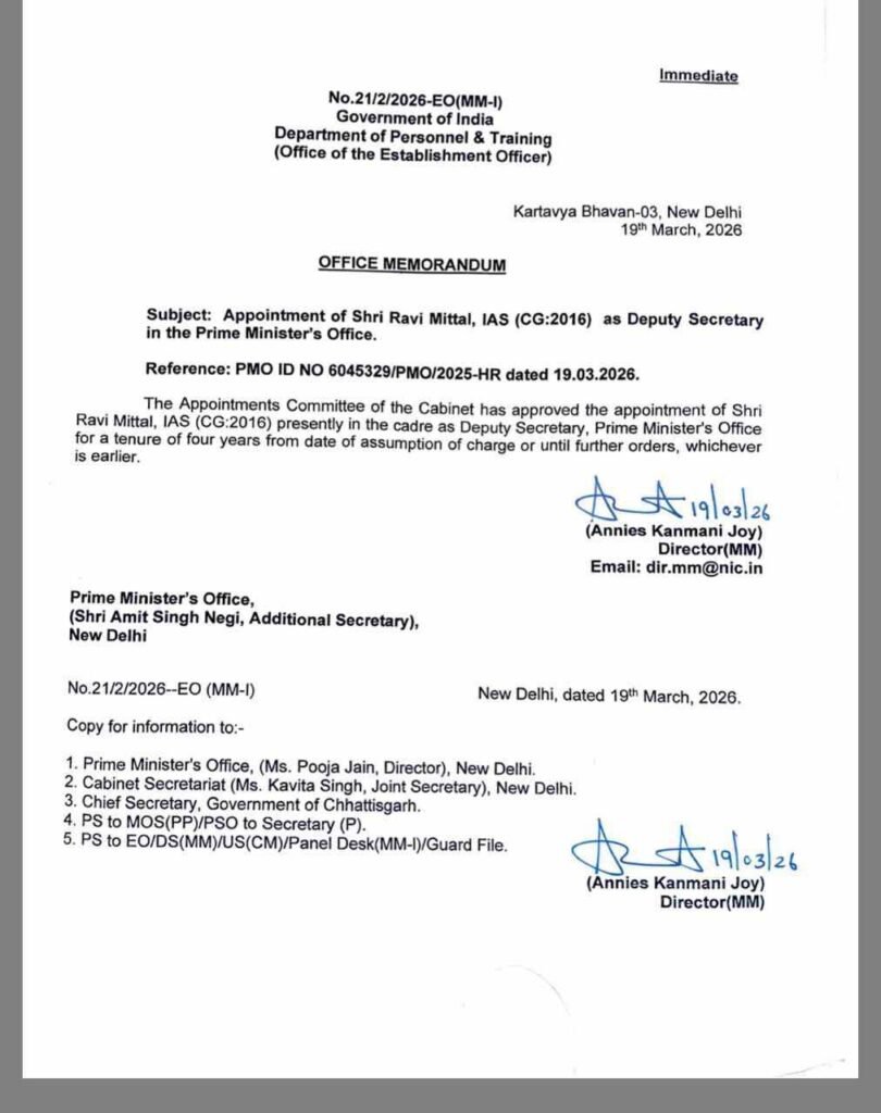 छत्तीसगढ़ से एक बड़ी खबर सामने आई है, जहां 2016 बैच के IAS अधिकारी डॉ. रवि मित्तल को केंद्र सरकार ने अहम जिम्मेदारी सौंपी है। डॉ. मित्तल को प्रतिनियुक्ति पर प्रधानमंत्री कार्यालय में उप सचिव के पद पर नियुक्त किया गया है।
