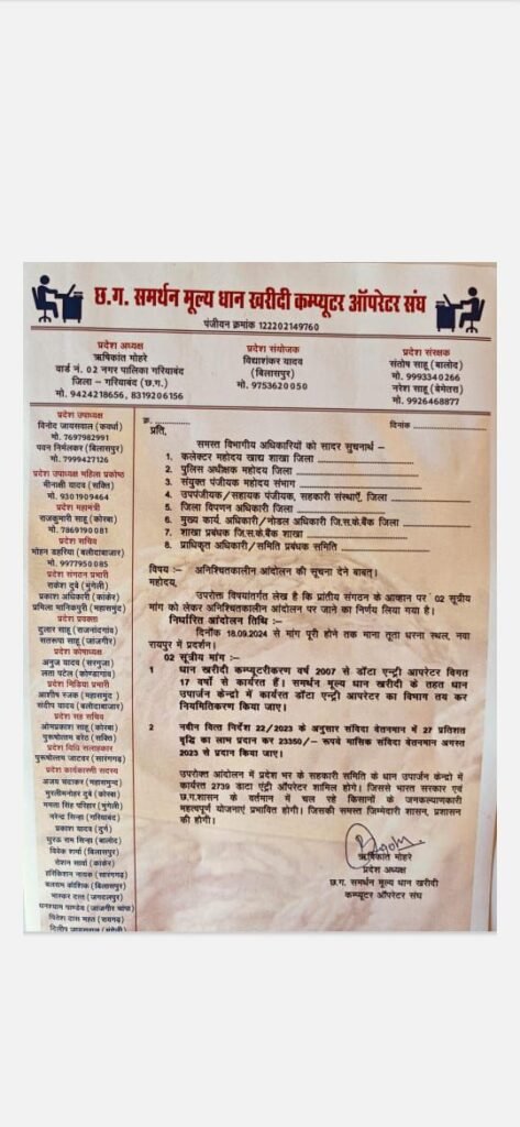 1..धान खरीदी कम्प्यूटरीकरण वर्ष 2007 से डाटा एंट्री ऑपरेटर विगत 17 वर्षों से कार्यरत है। समर्थन मूल्य धान खरीदी के तहत धान उपार्जन केंद्रों में कार्यरत डाटा एंट्री ऑपरेटर का विभाग तय कर नियमितीकरण किया जाए।