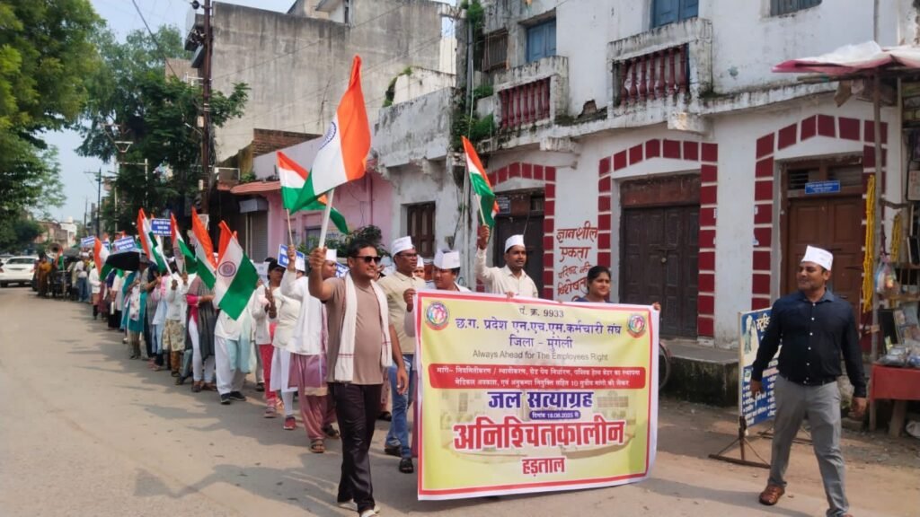 मुंगेली- आर-पार की लड़ाई पर उतर आए एनएचएम के संविदा स्वास्थ्य कर्मचारियों ने अनिश्चित कालीन हड़ताल के आज 23वे दिन हड़ताल स्थल आगर खेल परिसर से रैली निकालकर नगर के पुलघाट आगर नदी पर जल सत्याग्रह कर अपना विरोध जताया। कर्मचारियों मे सरकार के खिलाफ भारी आक्रोश रहा।
