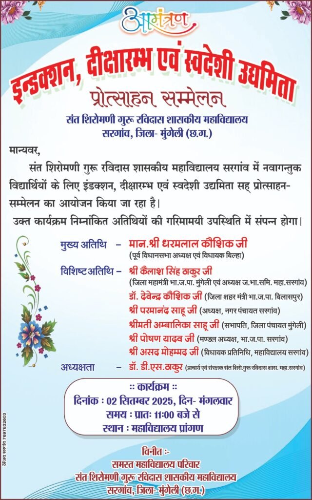 इंडक्शन, दीक्षारंभ एवं स्वदेशी उद्यमिता प्रोत्साहन सम्मेलन का भव्य आयोजन आज प्रातः 11:00 बजे महाविद्यालय प्रांगण में किया जा रहा है। कार्यक्रम में मुख्य अतिथि के रूप में धरमलाल कौशिक पूर्व विधानसभा अध्यक्ष एवं विधायक बिल्हा,विशिष्ट अतिथि के रूप में कैलाश सिंह ठाकुर जिला महामंत्री भाजपा मुंगेली एवं अध्यक्ष जनभागीदारी समिति महाविद्यालय सरगांव, डॉ देवेंद्र कौशिक जिला शहर मंत्री भाजपा बिलासपुर, परमानंद साहू अध्यक्ष नगर पंचायत सरगांव, अंबालिका साहू सभापति जिला पंचायत मुंगेली, पोषण यादव मंडल अध्यक्ष भाजपा सरगांव, असद मोहम्मद विधायक प्रतिनिधि महाविद्यालय सरगांव व अध्यक्षता डॉ डी.एस. ठाकुर प्राचार्य एवं संरक्षक संत शिरोमणि गुरु रविदास शासकीय महाविद्यालय सरगांव विशेष रूप से उपस्थित रहेंगे।