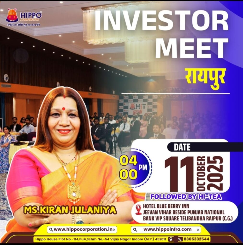 रायपुर। हिप्पो कॉरपोरेशन द्वारा 11 अक्टूबर 2025 को रायपुर में इन्वेस्टर मीट का आयोजन किया जा रहा है। यह कार्यक्रम शाम 4 बजे होटल ब्लू बेरी इन, जीवन विहार (पंजाब नेशनल बैंक के पास, वीआईपी स्क्वायर, तेलीबांधा) में आयोजित होगा।