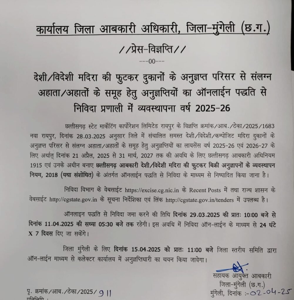 जिला आबकारी विभाग मुंगेली ने 2025-26 के लिए शुरू की प्रक्रिया