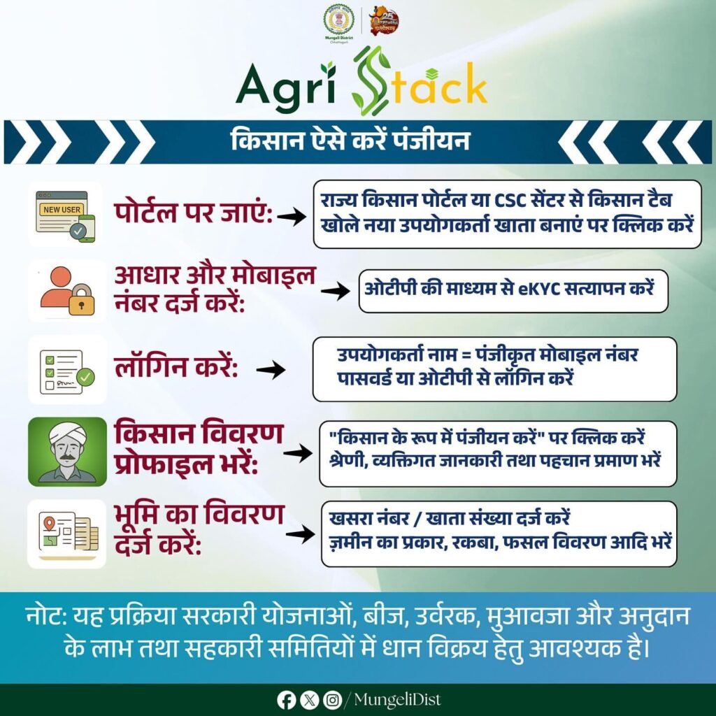 मुंगेली- शासन द्वारा किसानों के हित में एग्रीस्टैक पोर्टल पर किसान आईडी तैयार करने की प्रक्रिया शुरू की गई है। किसानों को शासन की विभिन्न योजनाओं का लाभ लेने के लिए एग्रीस्टैक पोर्टल पर पंजीयन कराना अनिवार्य है।