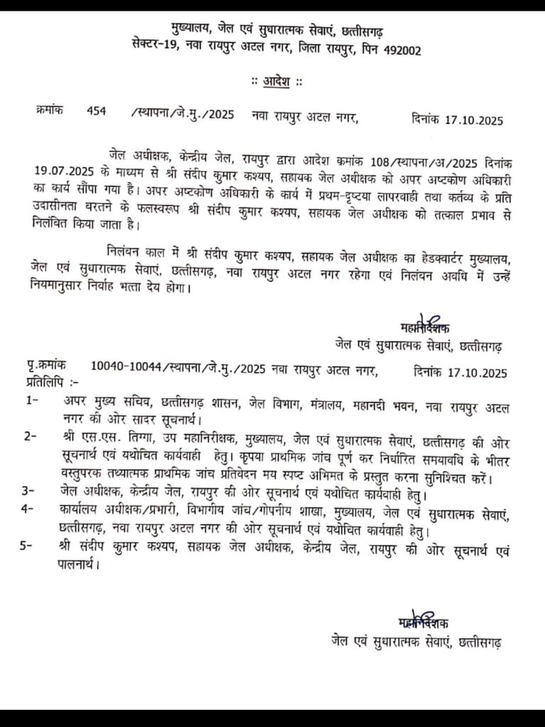 राजधानी रायपुर की सेंट्रल जेल में सुरक्षा व्यवस्था में लापरवाही सामने आने के बाद जेल प्रशासन ने बड़ी कार्रवाई की है। सहायक जेल अधीक्षक संदीप कुमार कश्यप को तत्काल प्रभाव से निलंबित कर दिया गया है।