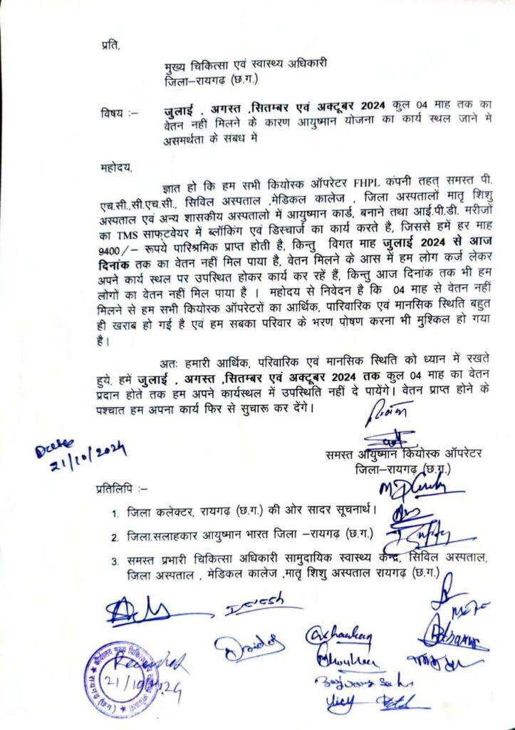 शैलेश शर्मा : रायगढ़:- भारत सरकार की महत्वाकांक्षी योजना “आयुष्मान योजना” के अंतर्गत काम करने वाले जिले के 21 कियोस्क ऑपरेटरों ने जुलाई से अक्टूबर 2024 तक का वेतन न मिलने के कारण काम बंद कर दिया है। यह जानकारी ऑपरेटरों ने मुख्य चिकित्सा एवं स्वास्थ्य अधिकारी, रायगढ़ को ज्ञापन के माध्यम से दी। ज्ञापन में उन्होंने बताया कि 4 महीनों से वेतन न मिलने की वजह से उनकी आर्थिक स्थिति दयनीय हो गई है और अब वे कर्ज में डूबे हुए हैं।