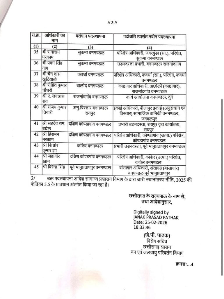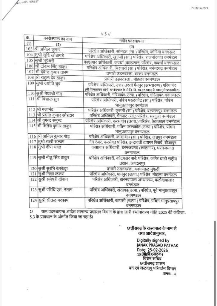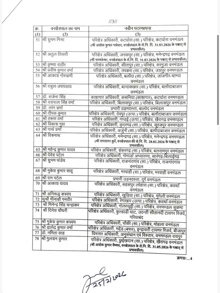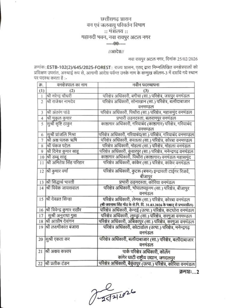 जारी सूची के अनुसार विभिन्न वनमंडलों, अनुसंधान एवं विस्तार इकाइयों और परिक्षेत्रों में पदस्थ अधिकारियों को नई जिम्मेदारियां सौंपी गई हैं.