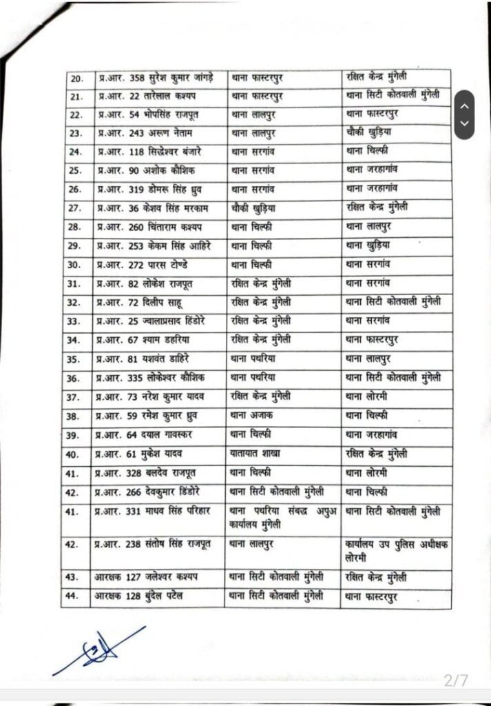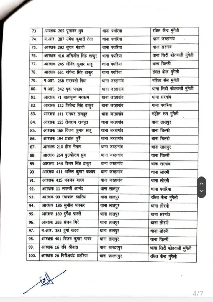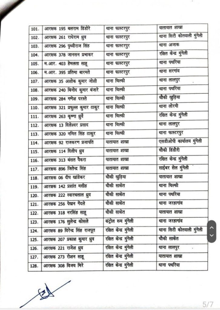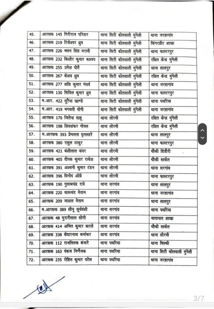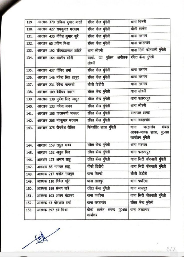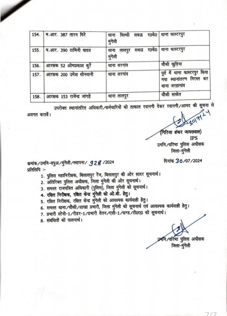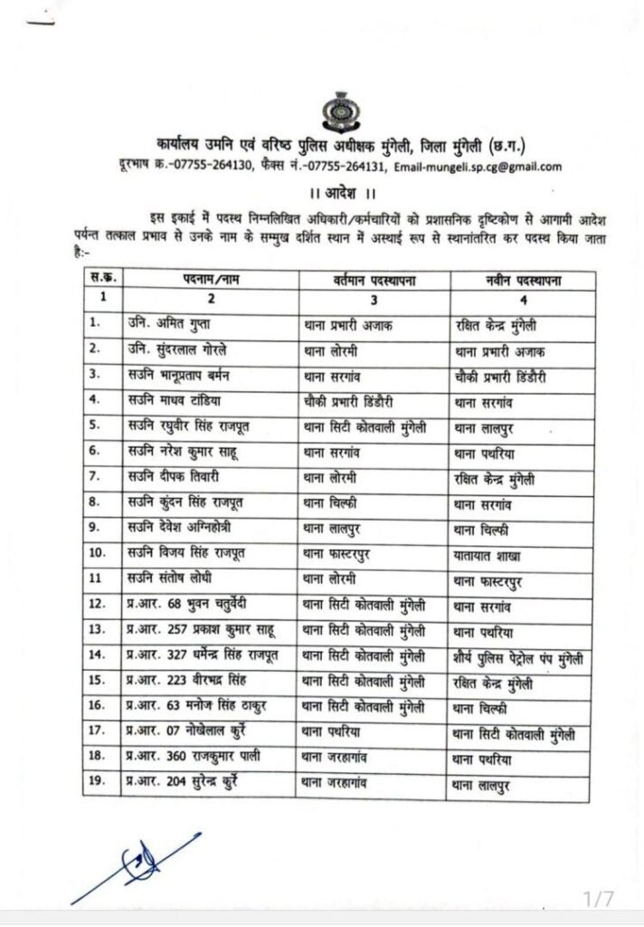 मुंगेली- वरिष्ठ पुलिस अधीक्षक मुंगेली गिरजाशंकर जायसवाल के आदेश से जिला मुंगेली में प्रसाशनिक दृष्टिकोण में कसावट लाने 2 निरीक्षक, 9 उपनिरीक्षक सहित 147 पुलिस कर्मियों के तबादले का नवीन आदेश जारी किया गया है।