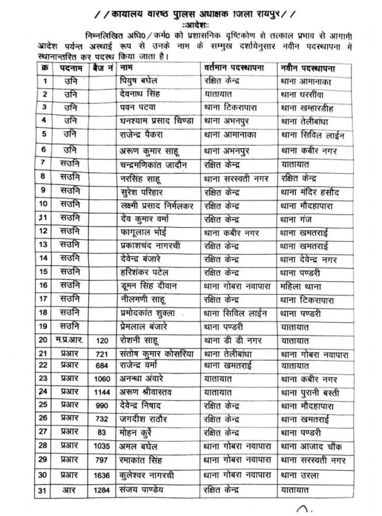 रायपुर। रायपुर पुलिस विभाग में बड़ा फेरबदल हुआ है. जिसमें SI, ASI, हेड कांस्टेबल समेत 55 पुलिसकर्मियों को एक जगह से दूसरी जगह भेजा गया है.