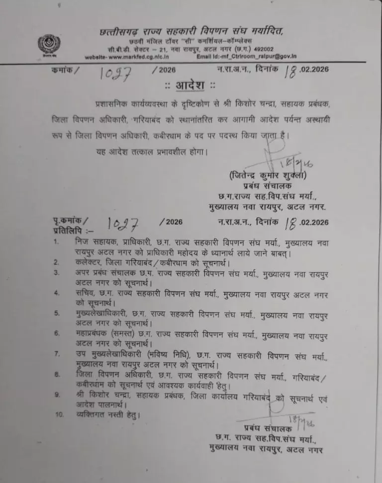 इसके बाद 18 फरवरी की देर रात आदेश जारी कर किशोर चंद्रा का तबादला Kabirdham कर दिया गया।
