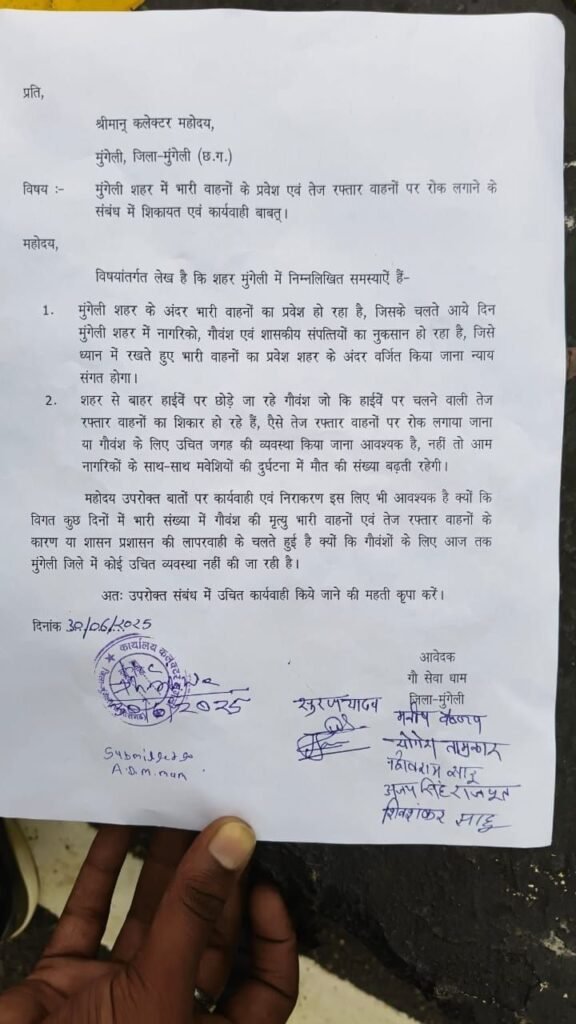 मुंगेली- शहर में बेतरतीब ढंग से प्रवेश कर रहे भारी वाहनों और तेज रफ्तार ट्रकों के कारण हो रही दुर्घटनाओं और जानमाल की क्षति को लेकर सोमवार को गौ सेवा धाम एवं अन्य सामाजिक संगठनों के प्रतिनिधियों ने जिला कलेक्टर को ज्ञापन सौंपा। ज्ञापन में प्रशासन से मांग की गई है कि शहर के भीतर भारी वाहनों के प्रवेश पर तत्काल रोक लगाई जाए और तेज रफ्तार वाहनों पर सख्त कार्यवाही की जाए।