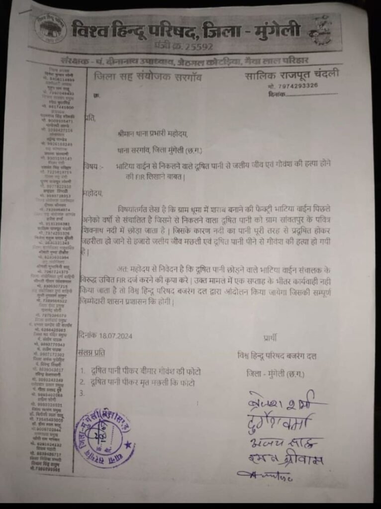 इस पूरे मामले में विश्व हिंदू परिषद और बजरंग दल ने भाटिया वाइन मर्चेंट के संचालक के खिलाफ सरगांव थाने में शिकायत करते हुए एफआईआर दर्ज करने की मांग की है…विहिप ने अपने शिकायत में बताया है की भाटिया वाइन मर्चेंट प्रबंधन के द्वारा जहरीली पानी पवित्र शिवनाथ नदी में छोड़ने से जलीय जीव जंतु और गौवंश की हत्या की गई इसलिए भाटिया वाइन मर्चेंट के संचालक के ऊपर एफआईआर एक हफ्ते के भीतर नही होने पर विश्व हिंदू परिषद और बजरंग दल आंदोलन करेगी…!