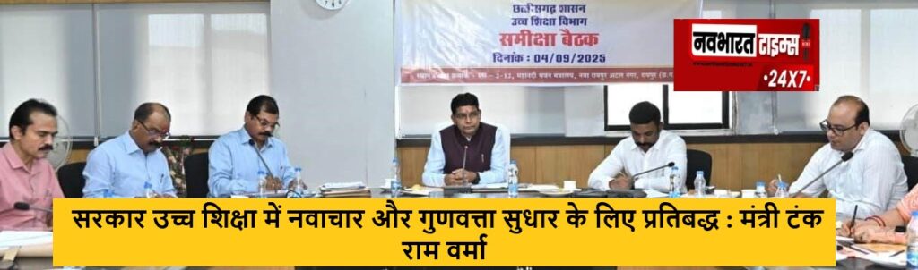 रायपुर, 04 सितम्बर 2025:उच्च शिक्षा मंत्री टंक राम वर्मा ने आज नवा रायपुर स्थित महानदी भवन में उच्च शिक्षा विभाग के अधिकारियों की बैठक लेकर आवश्यक दिशा-निर्देश दिए। मंत्री वर्मा ने राज्य की उच्च शिक्षा व्यवस्था को और अधिक पारदर्शी, गुणवत्तापूर्ण तथा रोजगारोन्मुख बनाने के लिए विभागीय अधिकारियों को सतत प्रयास करने के निर्देश दिए। उन्होंने स्पष्ट किया कि विभागीय समितियों के बीच बेहतर समन्वय स्थापित कर नई योजनाओं को समयबद्ध ढंग से क्रियान्वित किया जाए। इस अवसर पर उच्च शिक्षा विभाग के सचिव डॉ. एस. भारतीदासन, आयुक्त डॉ. संतोष कुमार देवांगन सहित संबंधित अधिकारी-कर्मचारी उपस्थित थे।