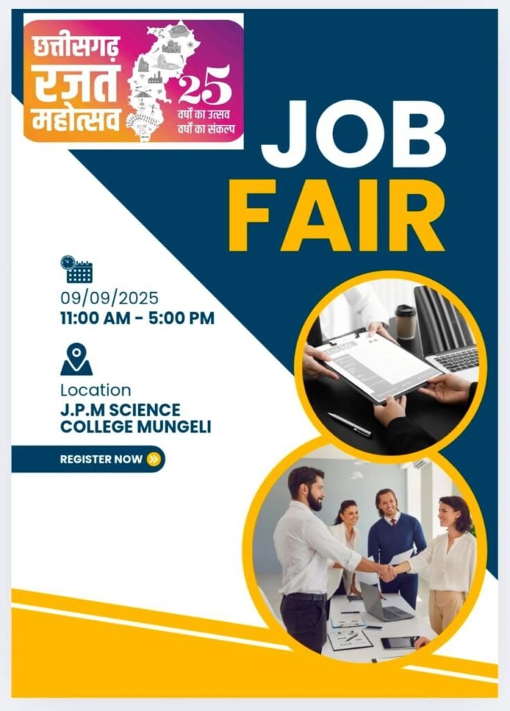 मुंगेली- छत्तीसगढ़ राज्य के 25 वर्ष पूर्ण होने पर मनाए जा रहे छत्तीसगढ़ रजत जयंती महोत्सव के अंतर्गत आज डॉ. ज्वाला प्रसाद मिश्र शासकीय विज्ञान महाविद्यालय, मुंगेली में जिला स्तरीय रोजगार मेले का आयोजन किया गया। यह आयोजन उच्च शिक्षा विभाग रायपुर एवं जिला कलेक्टर मुंगेली कुन्दन कुमार तथा जिला पंचायत सीईओ प्रभाकर पांडे के निर्देशन में सम्पन्न हुआ।