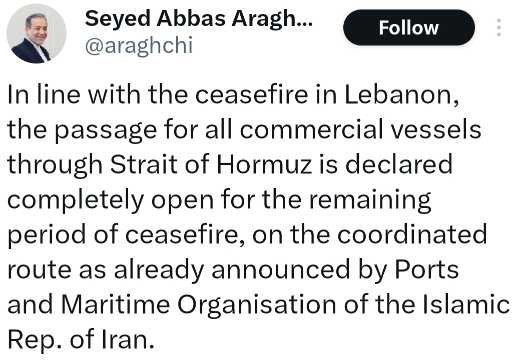 ईरान के विदेश मंत्री सैयद अब्बास अराघची ने सोशल मीडिया प्लेटफॉर्म एक्स (पूर्व में ट्विटर) पर जानकारी देते हुए कहा कि लेबनान में सीजफायर समझौते के अनुरूप होर्मुज जलडमरूमध्य से सभी वाणिज्यिक जहाजों की आवाजाही को पूरी तरह खोल दिया गया है।