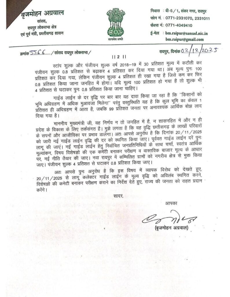 कलेक्टर गाइडलाइन दरों में बढ़ोतरी पर सांसद बृजमोहन अग्रवाल ने जताई चिंता, मुख्यमंत्री को लिखा पत्र