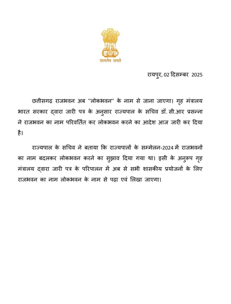 छत्तीसगढ़ राजभवन अब ‘‘लोकभवन‘‘ के नाम से जाना जाएगा। गृह मंत्रालय भारत सरकार द्वारा जारी पत्र के अनुसार राज्यपाल के सचिव डॉ.सी.आर प्रसन्ना ने राजभवन का नाम परिवर्तित कर लोकभवन करने का आदेश आज जारी कर दिया है।