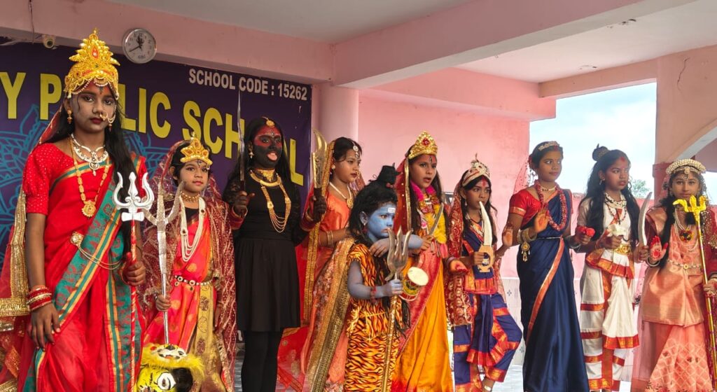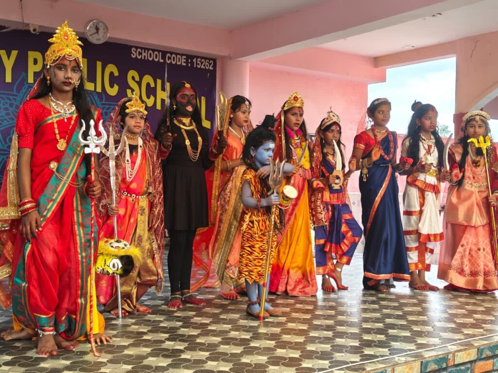 साथ ही एक बच्ची ने शंकर जी (भगवान शिव) की वेशभूषा में तांडव नृत्य प्रस्तुत किया, जो नवरात्रि की पौराणिक कथाओं को जीवंत रूप प्रदान कर रहा था। अन्य गतिविधियों में माता की आरती, भजन गायन और सांस्कृतिक नाटक शामिल थे, जिन्होंने बच्चों में धार्मिक और सांस्कृतिक जागरूकता बढ़ाई।इस अवसर पर स्कूल के प्राचार्य, शिक्षक-शिक्षिकाएं और स्टाफ सदस्य उपस्थित रहे।