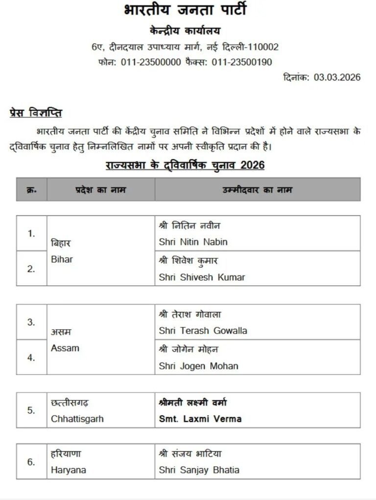 सबसे प्रमुख नाम पार्टी के राष्ट्रीय अध्यक्ष Nitin Nabin का है, जिन्हें बिहार से राज्यसभा चुनाव के लिए उम्मीदवार बनाया गया है। उनकी उम्मीदवारी को बिहार में पार्टी की अहम रणनीति के तौर पर देखा जा रहा है।