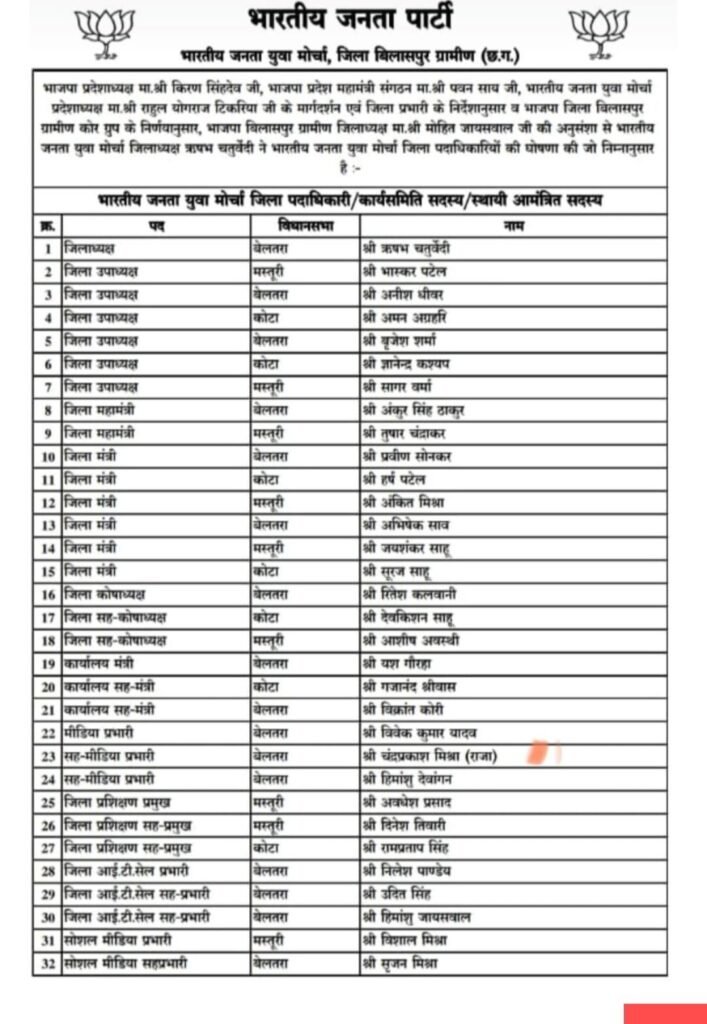 जिला अध्यक्ष ग्रामीण के अनुमोदन के पश्चात युवा मोर्चा जिलाध्यक्ष ने जिला पदाधिकारियों, कार्यसमिति सदस्यों तथा विभिन्न मंडलों के अध्यक्षों एवं महामंत्रियों की सूची जारी की।