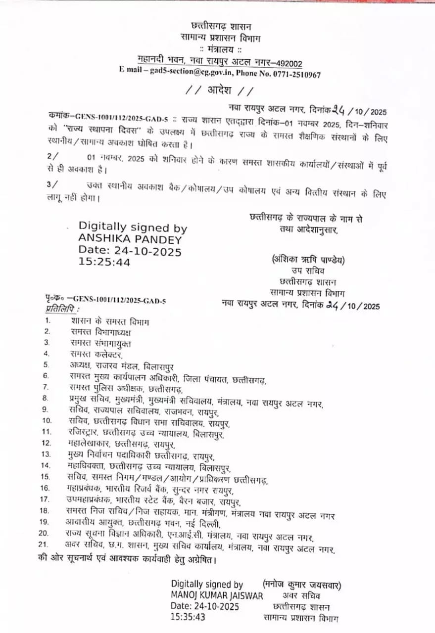 नवा रायपुर, 25 अक्टूबर 2025। छत्तीसगढ़ शासन के सामान्य प्रशासन विभाग ने एक नया आदेश जारी किया है, जो अब राज्य के सभी शैक्षणिक संस्थानों में चर्चा का विषय बना हुआ है। आदेश के अनुसार, 1 नवम्बर 2025 (शनिवार) को “राज्य स्थापना दिवस” के अवसर पर प्रदेश के सभी शैक्षणिक संस्थानों में स्थानीय/सामान्य अवकाश घोषित किया गया है।