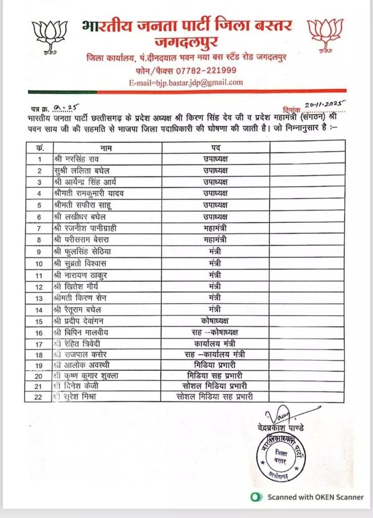 बस्तर जिला भाजपा में नए पदाधिकारी घोषित