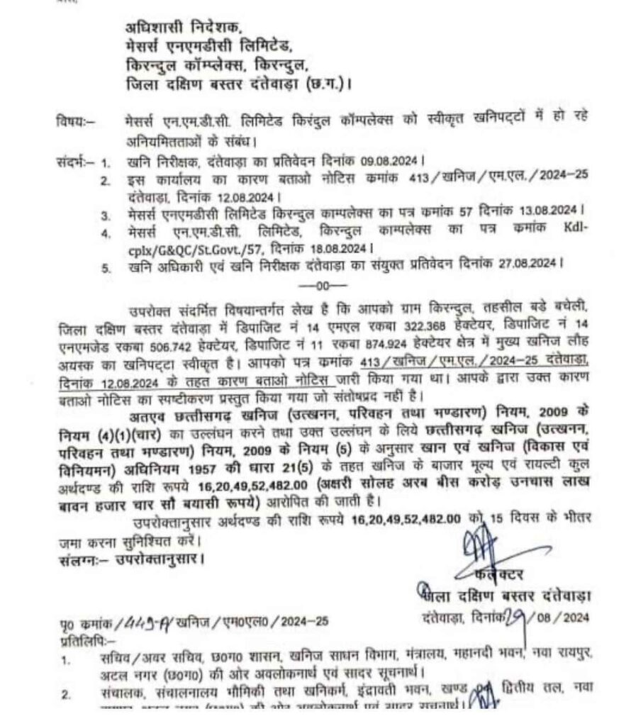 कलेक्टर की ओर से एनएमडीसी के अधिशासी निदेशक (ईडी) को जारी पत्र में ग्राम किरन्दुल, तहसील बड़े बचेली, जिला दक्षिण बस्तर दंतेवाड़ा में डिपाजिट नं 14 एमएल रकबा 322.368 हेक्टेयर, डिपाजिट नं 14 एनएमजेड रकबा 506.742 हेक्टेयर, डिपाजिट नं 11 रकबा 874.924 हेक्टेयर क्षेत्र में स्वीकृत लौह अयस्क के खनिपट्टा का जिक्र करते हुए इस संबंध में जारी नोटिस का जवाब संतोषप्रद नहीं होने की बात कही गई है.