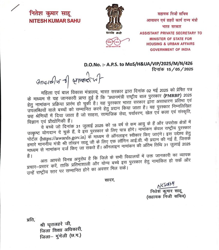 मुंगेली- भारत सरकार के महिला एवं बाल विकास मंत्रालय द्वारा प्रधानमंत्री राष्ट्रीय बाल पुरस्कार (PMRBP) 2025 के लिए नामांकन प्रक्रिया प्रारंभ कर दी गई है। इस संबंध में आवासन एवं शहरी कार्य राज्य मंत्री के सहायक निजी सचिव नितेश कुमार साहू द्वारा संबंधित अधिकारियों को जानकारी दी गई है। यह पुरस्कार असाधारण प्रतिभा और उपलब्धियों वाले बच्चों को छह श्रेणियों बचाव कार्य, सामाजिक सेवा, पर्यावरण, खेल, कला एवं संस्कृति, और नवाचार एवं प्रौद्योगिकी में सम्मानित करने के लिए प्रदान किया जाता है।