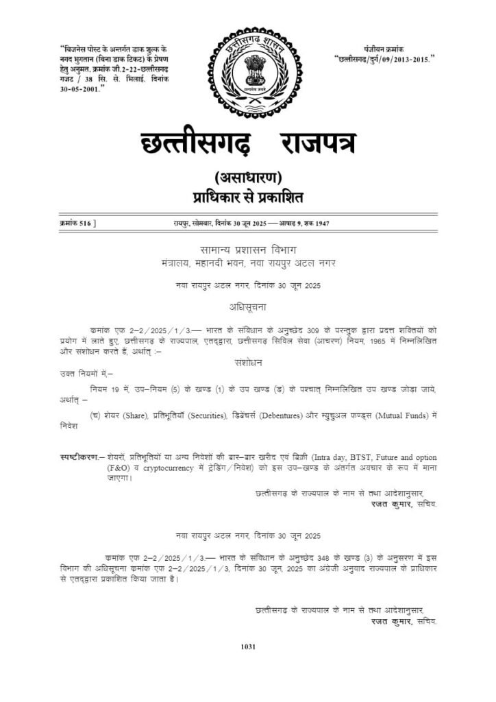 रायपुर। छत्तीसगढ़ शासन ने राज्य संवर्ग के अधिकारियों और कर्मचारियों के लिए एक बड़ा और सख्त निर्देश जारी किया है। अब सरकारी अधिकारी व कर्मचारी किसी भी प्रकार का निवेश—जैसे शेयर, सिक्योरिटीज, डिबेंचर्स, म्यूचुअल फंड और क्रिप्टोकरेंसी—नहीं कर सकेंगे।