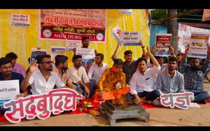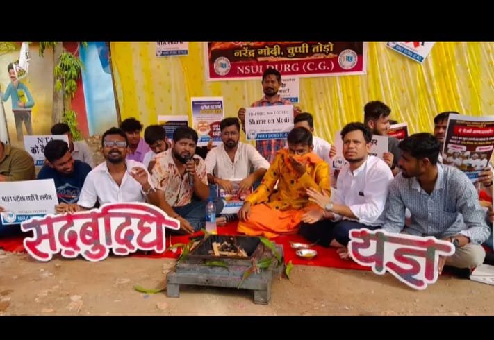 ऐसे भ्रष्ट और तानाशाही सरकार के गलत नीति के खिलाफ दुर्ग NSUI के तत्वधान में देश के प्रधानमंत्री और केंद्रीय शिक्षा मंत्री को नींद से जगाने सद्बुद्धि यज्ञ कर विरोध प्रदर्शन किया गया. इस दौरान प्रमुख रूप से आकाश कनौजिया प्रदेश महासचिव एनएसयूआई सुरेंद्र वाघमारे जिला महासचिव क्रिश, अंसु,चंदन,हर्ष,विशाल निक्कू चौबे शाश्वत पांडे वरुण केवलतनी अहमद वीसू,रतन,करण,आदित्य देवेश राजपूत,डोमेंद्र,राज देवांगन सूर्यकांत देशमुख,जतिन ठाकुर हरीश देवांगन,अमन दुबे,राहुल यादव,आदि भारद्वाज,गोल्डी कोसरे सोनू यादव सहित प्रदेश जिला विधानसभा ब्लॉक NSUI के पदाधिकारी भारी संख्या में उपस्थित थे..