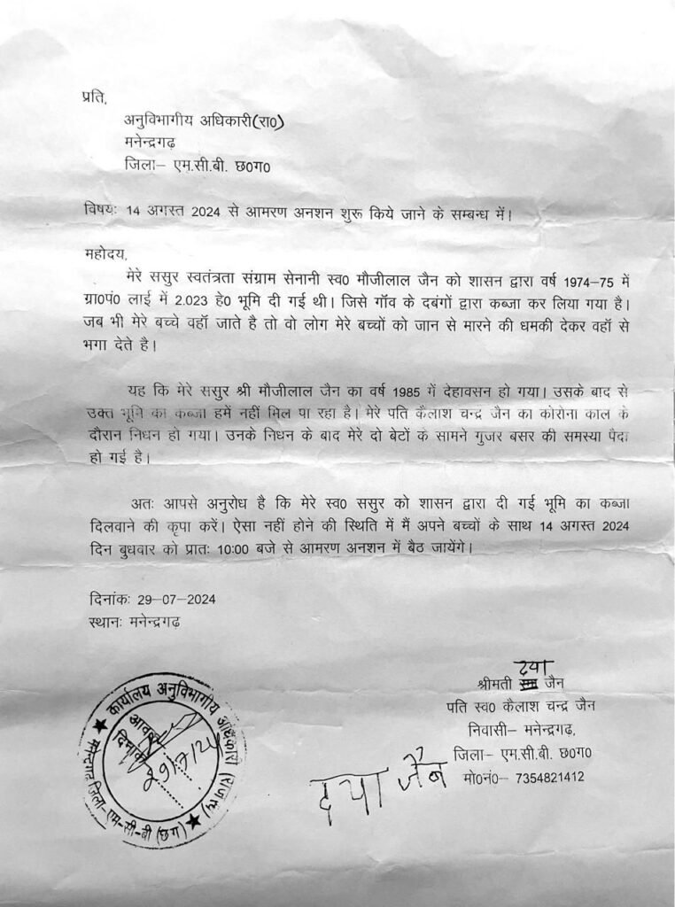 एसडीएम को सौंपे गए ज्ञापन में अनुरोध किया गया है कि मेरे स्व. ससुर को शासन द्वारा दी गई भूमि का कब्जा दिलवाने की कृपा करें । ऐसा नहीं होने की स्थिति में मैं अपने बच्चों के साथ 14 अगस्त बुधवार को सुबह 10 बजे से आमरण अनशन में बैठूंगी जिसकी संपूर्ण जिम्मेदारी स्थानीय प्रशासन की होगी.।