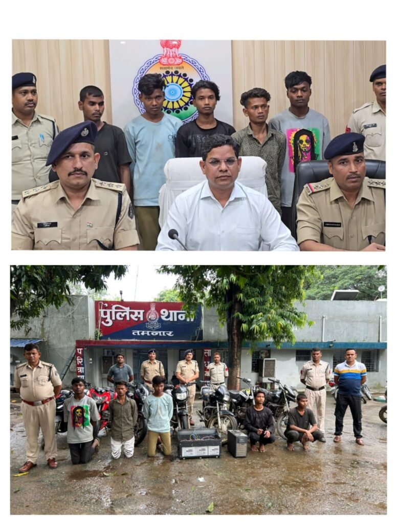 निर्देशों के पालन में उप पुलिस अधीक्षक अभिनव उपाध्याय के मार्गदर्शन पर थाना प्रभारी तमनार निरीक्षक आर्शीवाद राहटगांवकर द्वारा चोरी/नकबजनी के मामलों में माल-मुल्जिम की पतासाजी की जा रही थी जिसमें तमनार पुलिस को सुने मकानों में सेंधमारी और बाइक चोरी में सक्रिय गिरोह के 06 आरोपियों को गिरफ्तार करने में सफलता मिली है । आरोपियों से पुलिस ने चोरी के 05 बाइक, एक बैटरी, एक युपीएस और आरोपियों की 02 बाइक को बरामद कर जप्त किया गया है, आरोपियों की गिरफ्तारी से थाना तमनार में 03 आपराधों का खुलासा हुआ है ।