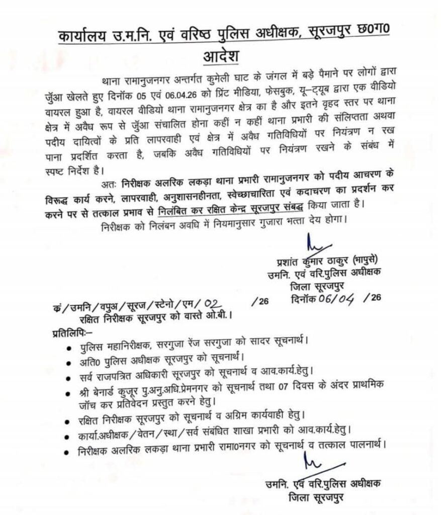 काम में लापरवाही बरतने पर एसपी प्रशांत ठाकुर ने रामानुजनगर थाना प्रभारी अलरिक लकड़ा और आरक्षक पंकज सिंह को निलंबित कर दिया है। आदेश में कहा गया है कि सोशल मीडिया में जुआ खेलते लोगों का वीडियो वायरल हुआ था।