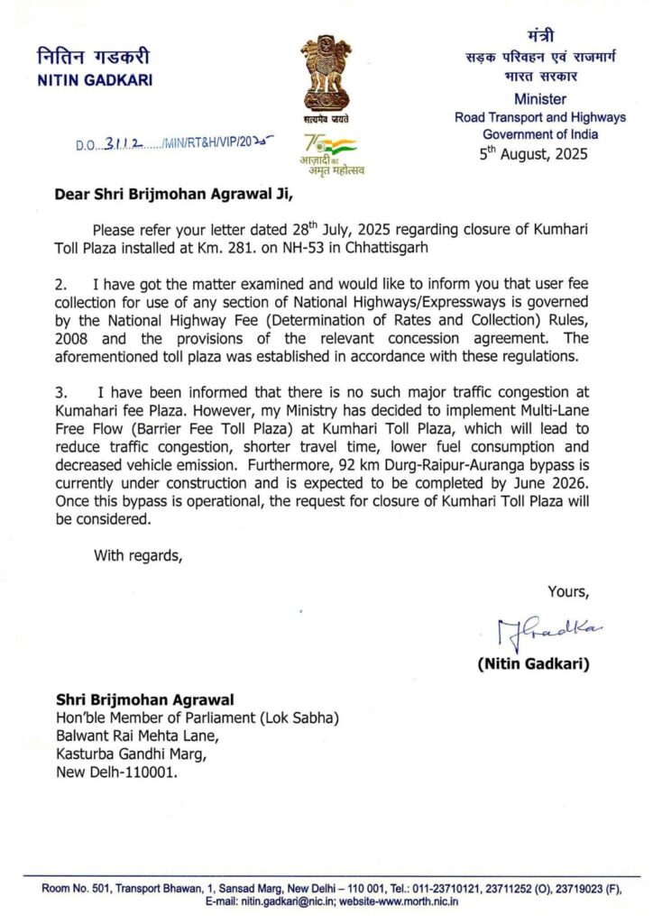 रायपुर लोकसभा क्षेत्र के सांसद एवं भाजपा के वरिष्ठ नेता बृजमोहन अग्रवाल के निरंतर प्रयासों का बड़ा परिणाम सामने आया है। केंद्र सरकार ने कुम्हारी टोल प्लाजा को जून 2026 से पूर्ण रूप से बंद करने की स्वीकृति दे दी है।