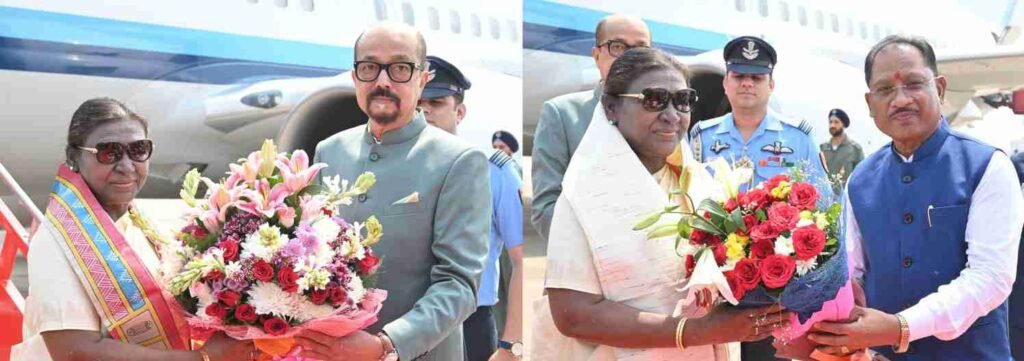 रायपुर /राष्ट्रपति द्रौपदी मुर्मु का आज छत्तीसगढ़ आगमन पर स्वामी विवेकानंद एयरपोर्ट रायपुर में राज्यपाल रमेन डेका, मुख्यमंत्री विष्णु देव साय, केंद्रीय राज्य मंत्री तोखन साहू, उपमुख्यमंत्री द्वय अरुण साव एवं विजय शर्मा, महापौर मीनल चौबे, रमेश बैस, सरोज पाण्डे, गौरीशंकर अग्रवाल, शिवरतन शर्मा सहित अन्य जनप्रतिनिधियों और अधिकारियों ने स्वागत किया।
