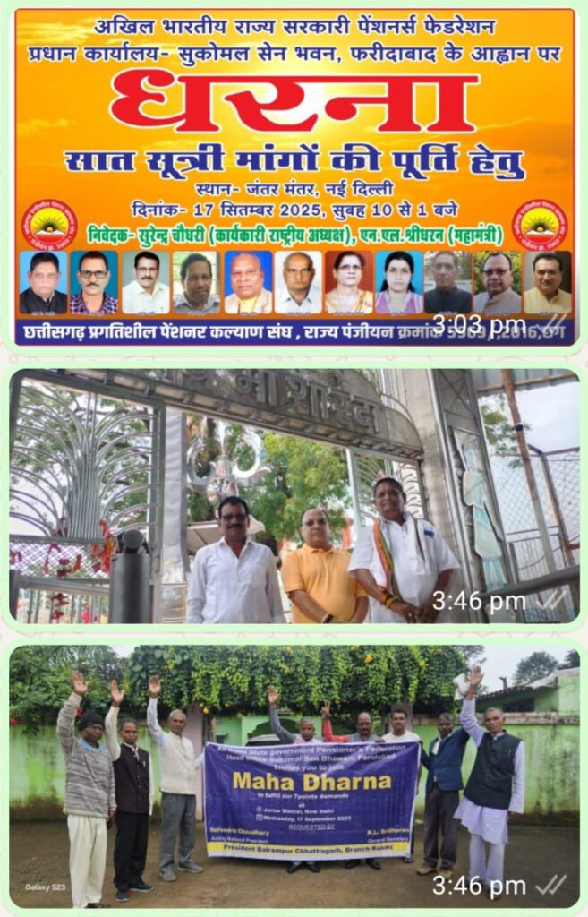 17 सितंबर को जंतर मंतर दिल्ली में आयोजित पेंशनरों के इस धरना में बिलासपुर संभाग से आर के थवाईत प्रदेश अध्यक्ष, सुन्दरसिंह ठाकुर महामंत्री, अशोक राठौर सचिव,अंबिकापुर संभाग से