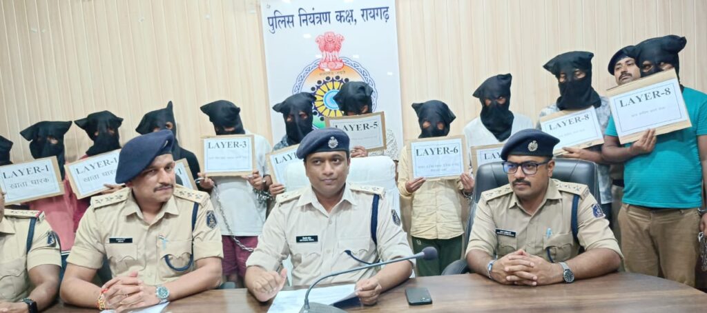 LAYER -8 मुख्य कॉलिंग टीम जो फ़र्ज़ी नंबरों का प्रयोग कर प्रार्थी को कॉल कर ठगी को अंजाम देते थे एवं पैसा आने पर नीचे के सभी लेयर्स को यथोचित कमीशन बाटते थे । इस प्रकार पुलिस की पकड़ में आने से बचने के हर संभव प्रयास के बावजूद भी रायगढ़ पुलिस द्वारा अपनी सूझबूझ और कार्यकुशलता से इस गिरोह का भांडाफोड़ किया गया है। प्रकरण में विवेचना जारी है निकट भविष्य में और भी आरोपियों के पकड़े जाने की संभावना है ।