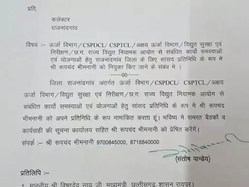राजनांदगांव: रूपचंद भीमनानी को राजनांदगांव सांसद संतोष पाण्डेय ने अपना प्रतिनिधि नियुक्त किया है। उन्हें यह नई जिम्मेदारी विद्युत मंडल से संबंधित कार्यों के लिए सौंपी गई है।