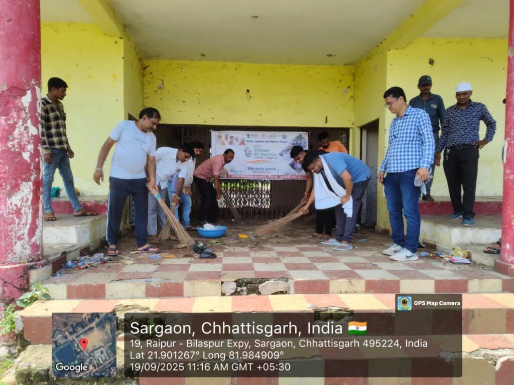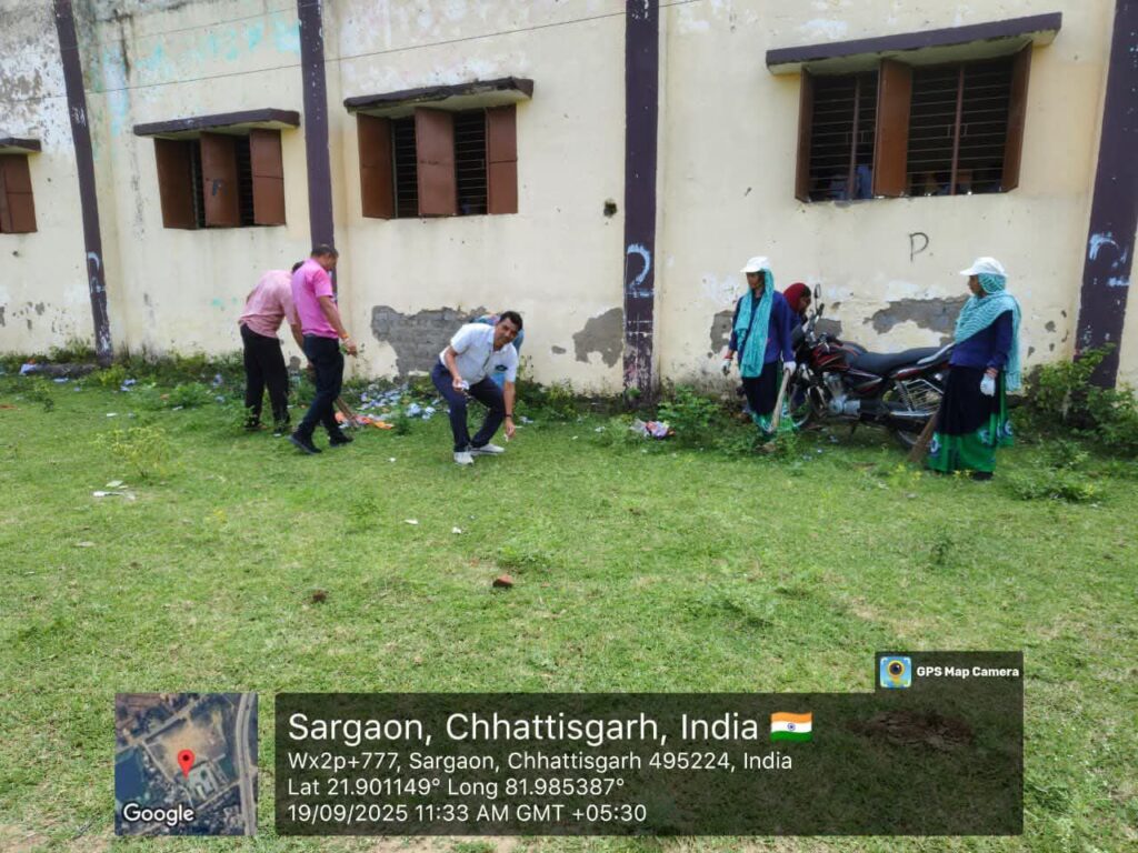सरगांव, 19 सितंबर 2025: नगर पंचायत सरगांव के उन्मुक्त खेल मैदान में सेवा पखवाड़ा के अंतर्गत भव्य स्वच्छता अभियान का आयोजन किया गया, जिसमें अधिकारियों और नगरवासियों के सामूहिक प्रयास से मैदान को स्वच्छ और चमकदार बनाया गया।