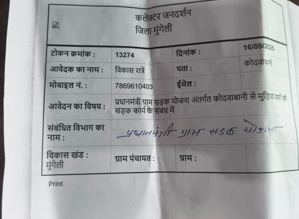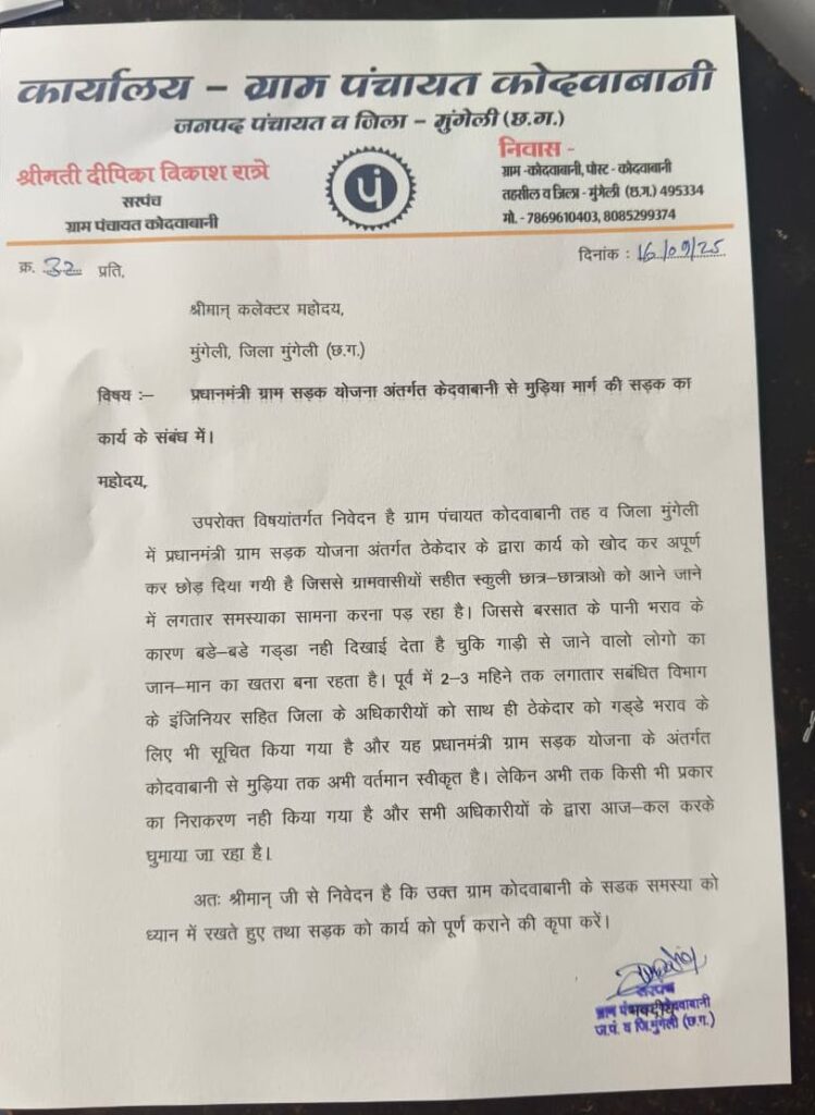 उन्होंने कलेक्टर से अनुरोध किया कि इस मामले को गंभीरता से लेते हुए ठेकेदार और अधिकारियों को निर्देश दिए जाएं, ताकि सड़क का निर्माण कार्य जल्द पूरा हो सके। रात्रे ने यह भी उल्लेख किया कि पिछले दो-तीन महीनों में इंजीनियर, एसडीओ और जिला अधिकारियों सहित ठेकेदार को बार-बार सूचित किया गया, लेकिन वे केवल टालमटोल करते रहे और समस्या पर ध्यान नहीं दिया। कलेक्टर से इस मुद्दे का शीघ्र निराकरण करने की मांग की गई है।
