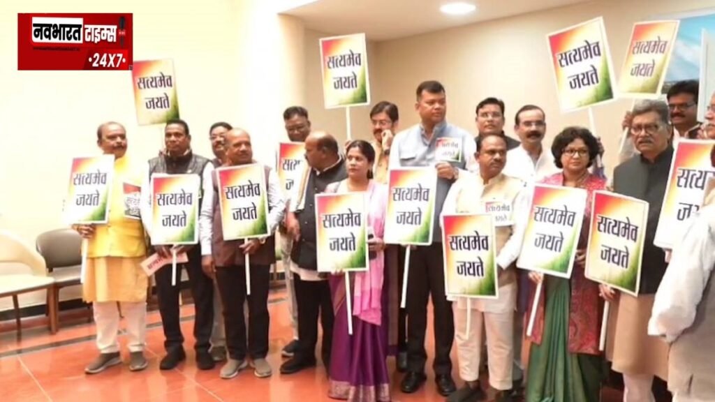 रायपुर: छत्तीसगढ़ विधानसभा के शीतकालीन सत्र के चौथे दिन सदन का माहौल उस वक्त पूरी तरह गर्मा गया, जब कांग्रेस के सभी विधायक ‘सत्यमेव जयते’ की तख्तियां लेकर नारेबाजी करते हुए सदन में पहुंचे। नेशनल हेराल्ड मामले में सोनिया गांधी और राहुल गांधी के खिलाफ ईडी की कार्रवाई के विरोध में कांग्रेस विधायकों ने जोरदार प्रदर्शन किया।