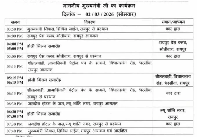 निर्धारित कार्यक्रम के अनुसार मुख्यमंत्री शाम 4 बजे रायपुर प्रेस क्लब के होली मिलन समारोह में भाग लेंगे। इसके बाद वे शाम 5 बजे धरसींवा में आयोजित कार्यक्रम में शामिल होंगे।