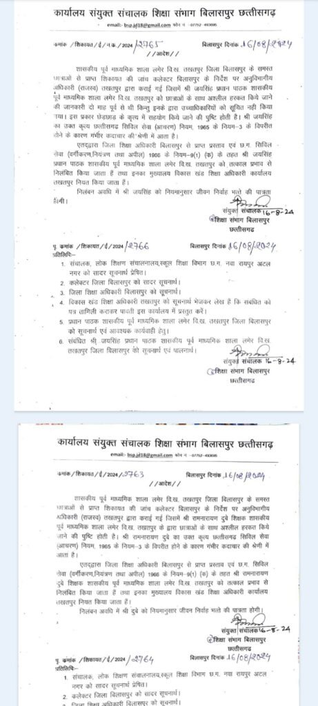 दोनों के गंभीर कृत्य के कारण तत्काल प्रभाव से दोनों को निलंबित किया गया है। दोनों का मुख्यालय विकासखंड शिक्षा अधिकारी कार्यालय तखतपुर नियत किया गया है।