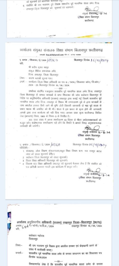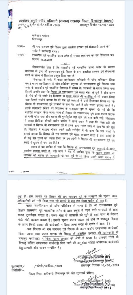 (जे के मिश्र) : बिलासपुर : शासकीय पूर्व माध्यमिक शाला लमेर विकासखंड तखतपुर की छात्राओं ने कलेक्टर अवनीश शरण से शिकायत की थी कि विद्यालय में शिक्षक राम नारायण दुबे उनसे छेड़छाड़ करता है. कलेक्टर अवनीश शरण ने इसे गंभीरता से लिया और एसडीएम तखतपुर से इसकी जांच कराई गई.