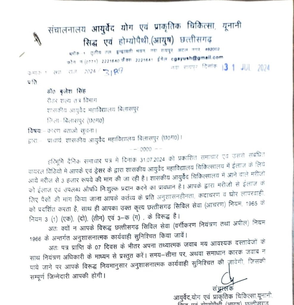 बिलासपुर : स्थानीय शासकीय आयुर्वेद महाविद्यालय के शल्य तंत्र विभाग के रीडर डॉ. बृजेश सिंह को शो कॉज नोटिस जारी किया गया है। सोशल मीडिया में मरीज से इलाज के बदले में रूपये मांगे जाने संबंधी वायरल वीडियों के आधार पर संचालक आयुष, रायपुर ने उन्हें नोटिस जारी किया है।